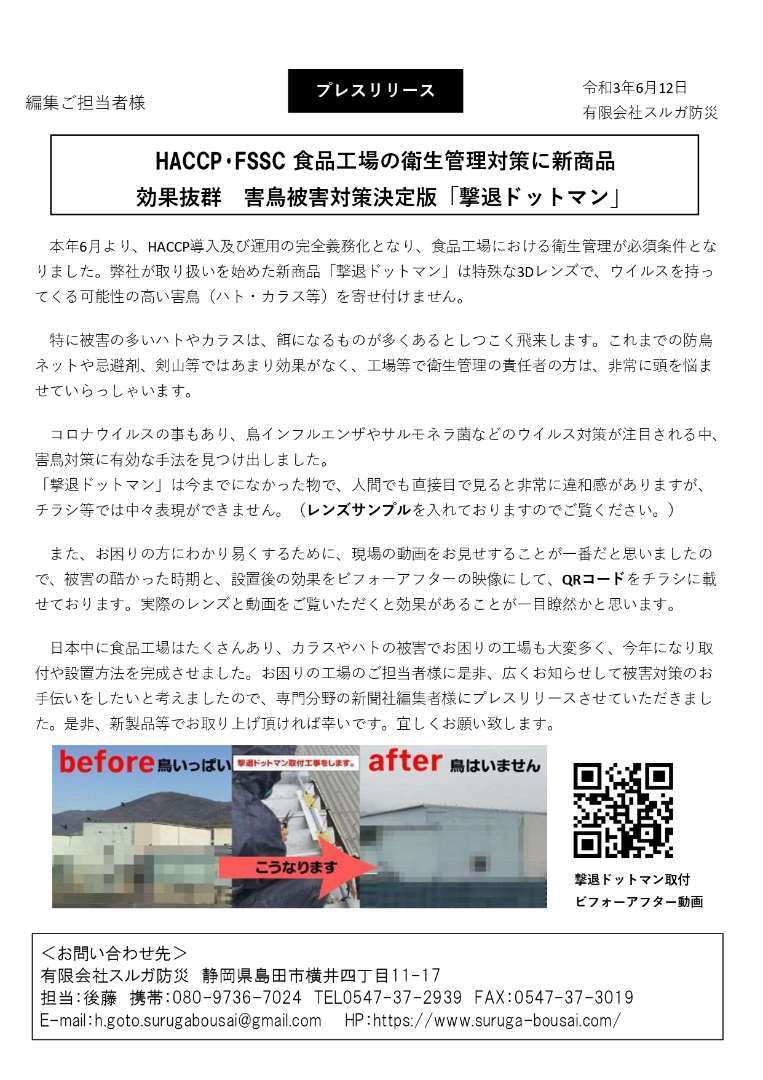 この度、弊社が取り扱っている害鳥対策用品(ハト対策・カラス対策等)である「撃退ドットマン」のプレスリリースを作成しました。