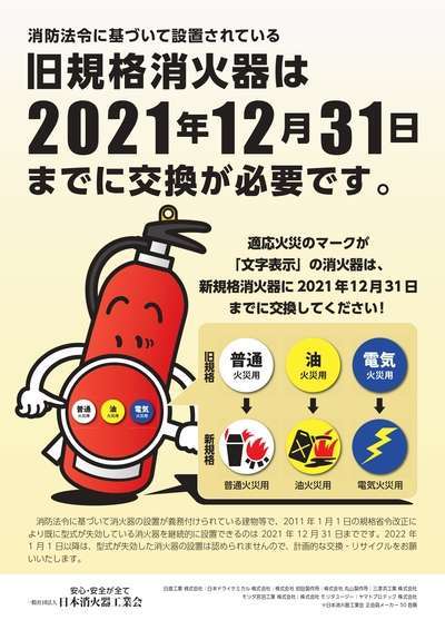 【消防法令改正】旧規格消火器は 2021年12月 31日 までに交換が必要です。