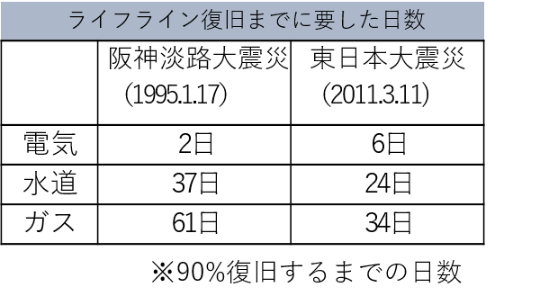 過去の経験によれば、災害発生からライフライン復旧までは1週間以上を要するケースが多くみられます。また、災害支援物資が3日以上到着しないことや、物流機能の停止によって、1週間は日常生活用品が手に入らないことが想定されます。