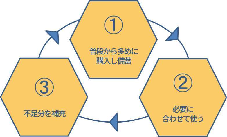 ①>②>③と続く「ローリングストック」を習慣にし、災害時でも使い慣れたものを使える環境を作りましょう。また、備蓄品それぞれの賞味期限や使用期限の切れていることのないよう、普段から食べたり使ったりして確認しましょう。
