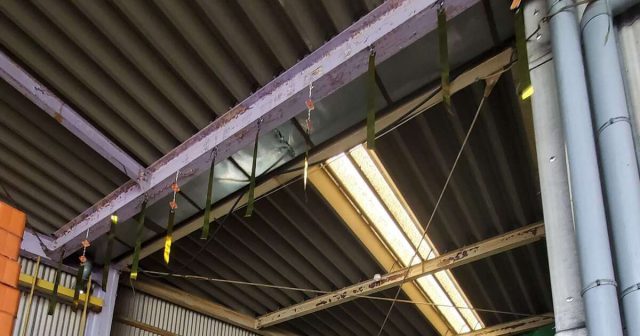 運送会社の一部にハトや小鳥が見受けられるため、吊下げ式3Dとドットマンテープ、床には床置き用まといを設置しました。