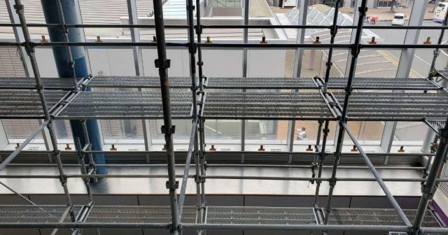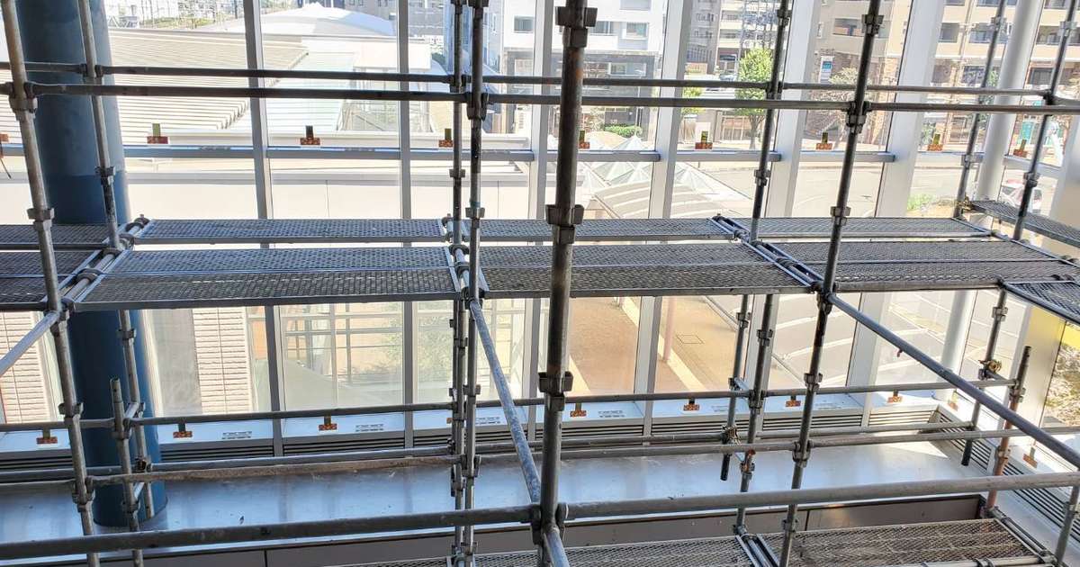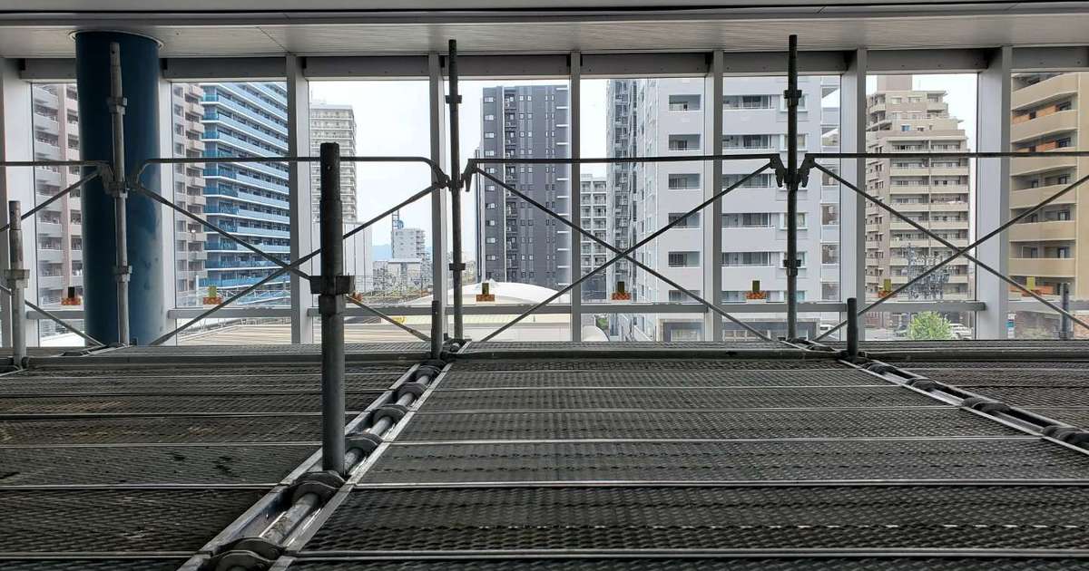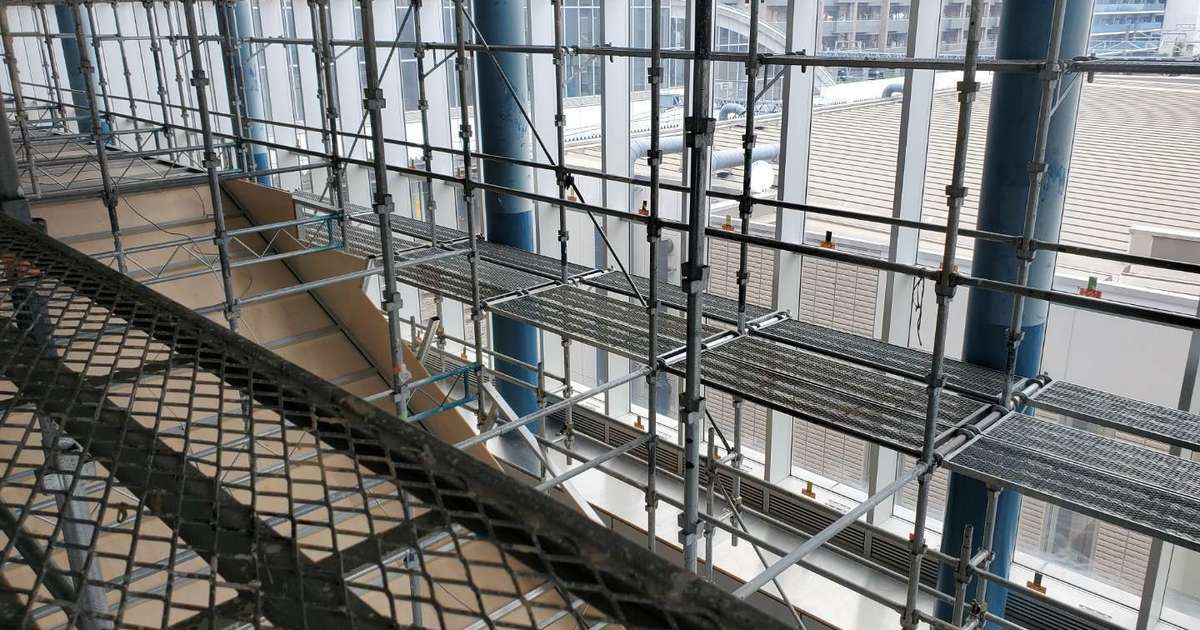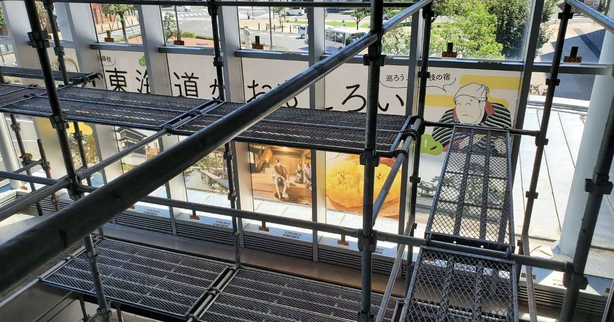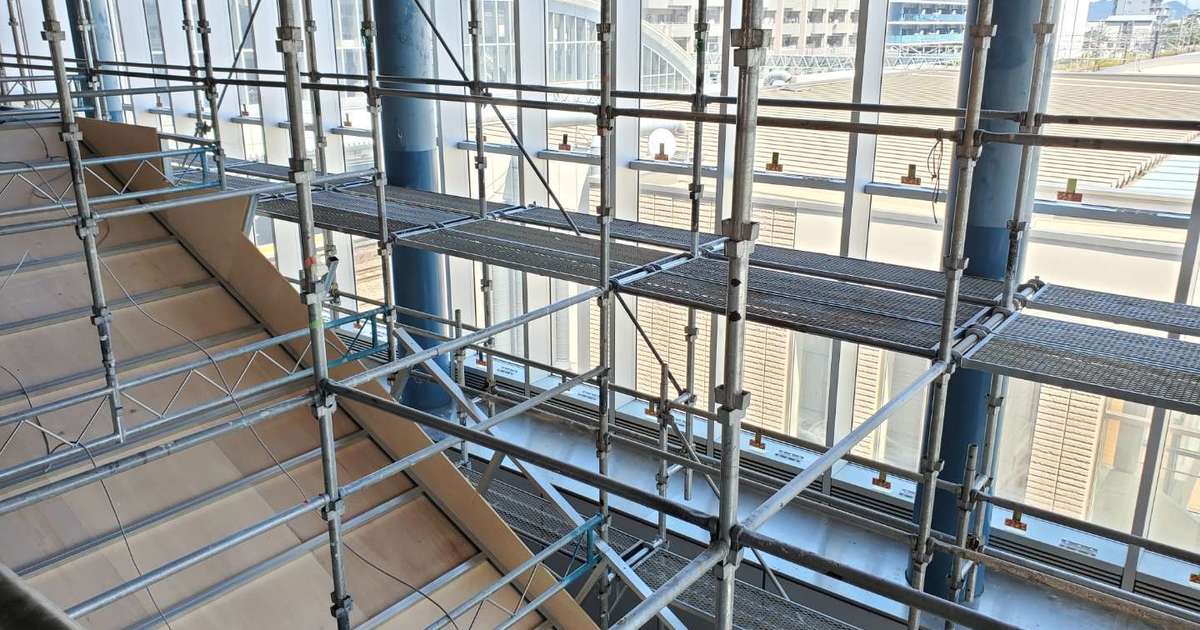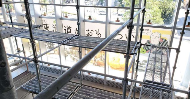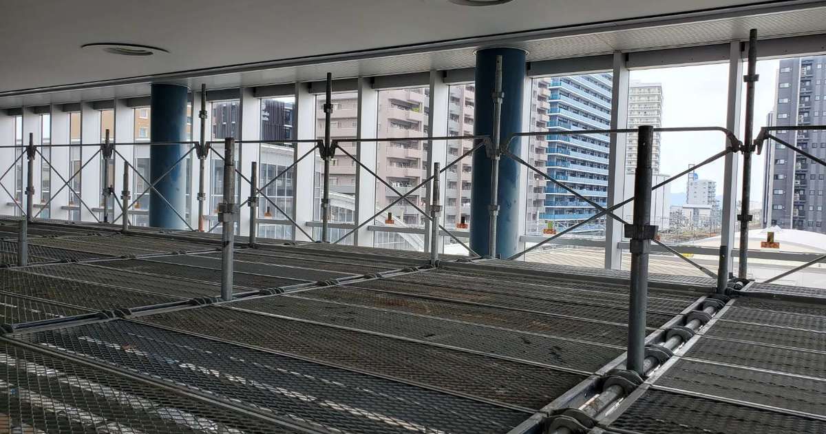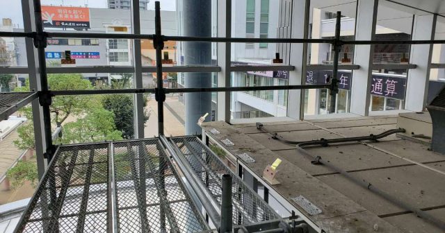 撃退ドットマン 某駅(静岡県中部) 撃退ドットマン 駅の吹き抜け部分からハトが侵入し、糞害がひどい場所の施工を行いました。 こちらの駅は一度施工を行いましたが、今回は足場を組んで普段作業できない場所を施工していきました。